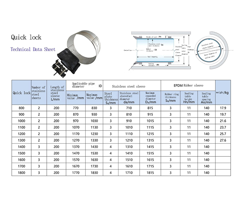 Kunci cepet stainless steel kasusun saka krah stainless steel kualitas dhuwur, mekanisme ngunci khusus lan ring karet EPDM; Dibandhingake karo pangolahan repair lokal liyane, iku bisa digunakake kanggo ndandani lokal pipo saluran sembarang materi lan pipo sumber banyu ing meksa tartamtu. Nduwe karakteristik ora ngobati, ora ana busa, operasi sing gampang, linuwih lan efisiensi.